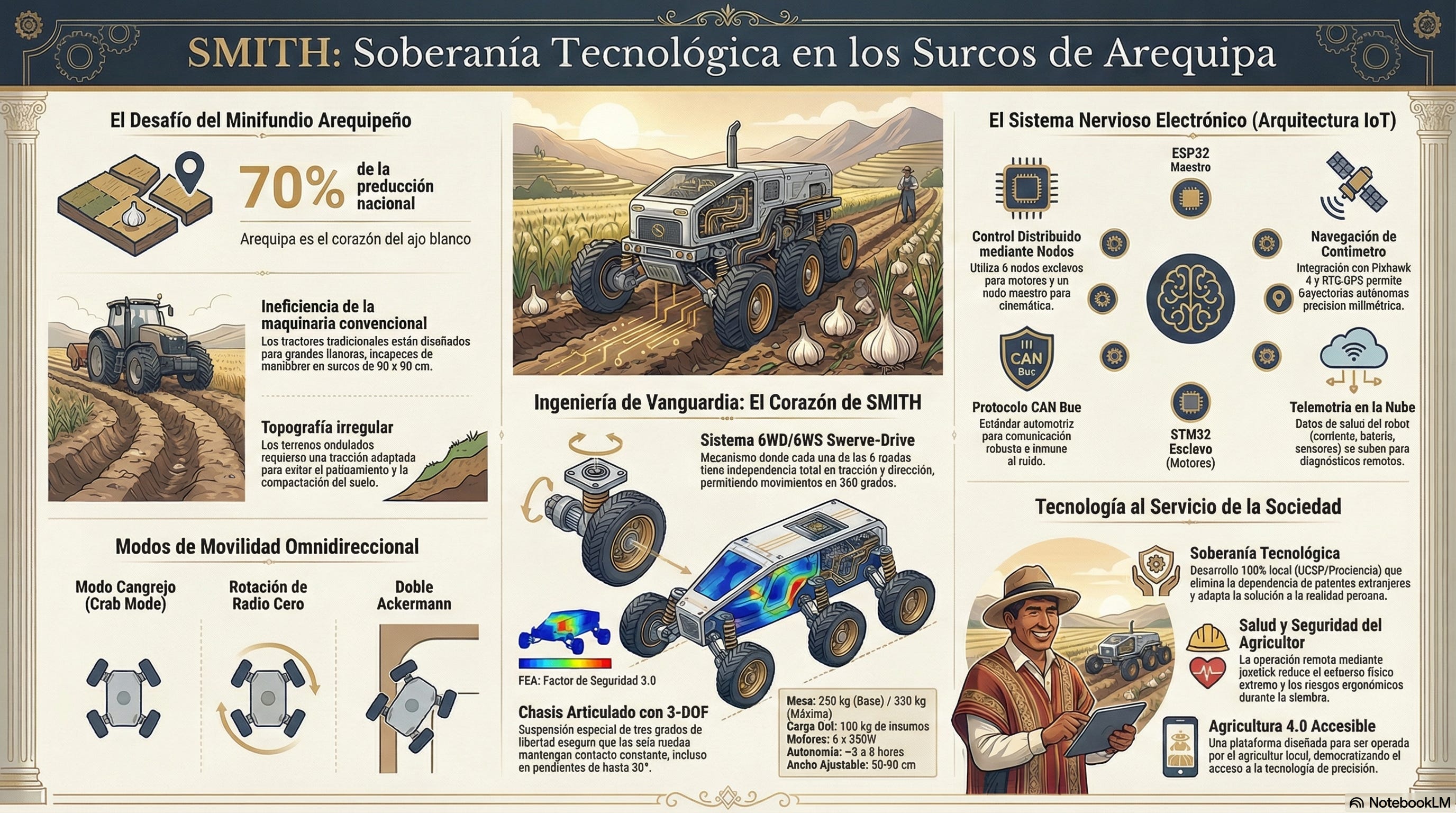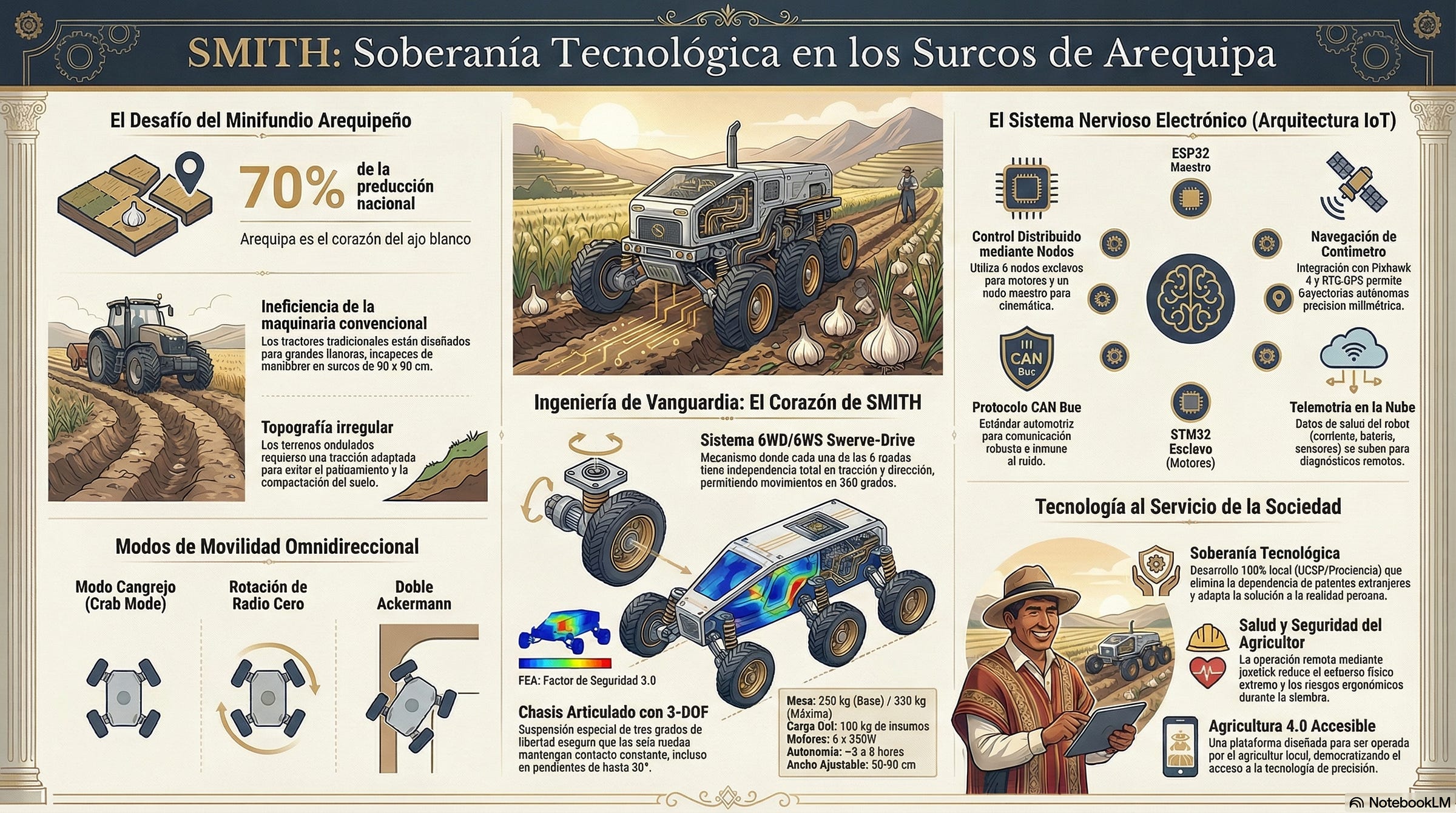 ¿Puede la alta tecnología salvar tradiciones agrícolas milenarias? En este episodio, exploramos el fascinante proyecto SMITH (Smart Mobile Intelligent Terrain Handler), una plataforma robótica soberana desarrollada en la Universidad Católica San Pablo para transformar el cultivo de ajo blanco en la accidentada campiña de Arequipa.