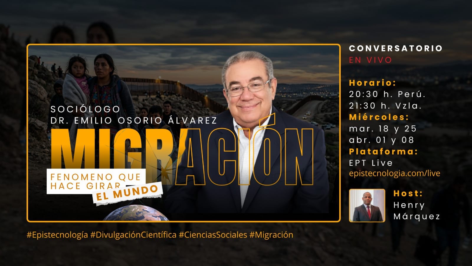 A lo largo de 4 semanas, nuestro director Henry Adolfo Márquez Mercado y el Dr. Emilio Osorio Álvarez (sociólogo y demógrafo), transformarán la historia personal y los datos, analizando desde la inversión del mapa migratorio hasta la aporofobia y el futuro de nuestra región.